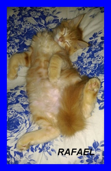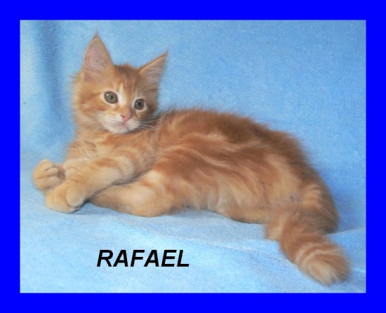 RAFAEL RYSI PAZUR(po czempionach) jest rudym, klasycznie pręgowanym, dorodnym kocurkiem.Spośród rodzeństwa wyróżnia się troszkę dłuższym futrem. Jest rozpieszczonym , lubiącym sie przytulać kociakiem. To kociak dla konesera! Może zostac ojcem pokoleń w hodowli ale moze też być kotkiem na kolanka. HCM N/N. Jest nauczony czystości i umie korzystać z drapaka,więc nie niszczy mebli. Posiada rodowód, książeczkę zdrowia,szczepienia a do nowego domu dostanie wyprawkę.Może zamieszkać w domu odpowiedzialnych ,kochających go ludzi. Nasza hodowla nazywa się RYSI PAZUR*PL i zarejestrowana jest w FPL. www.rysipazur.republika.pl